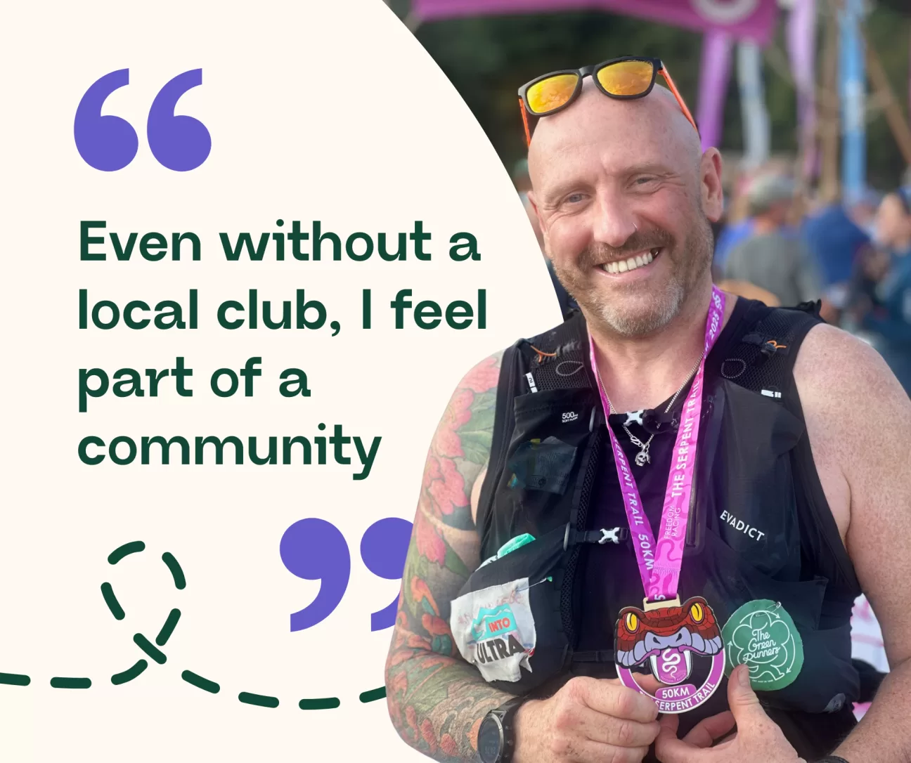 Last weekend I took part in the Serpent Trail 50k. Had a lovely chat with (TGR co-founder) Nina and others from into ultra before the trundle, and picked up their badge too. I gabbed to anyone slow enough or deranged enough to still be running at my pace about The Green Runners, Into Ultra, my pledge not to buy new kit, and lifestyle changes generally all of the way round – with maybe a few concessionary grunts and nods… Hopefully you can still see the pain in my eyes that caused waterworks on crossing the line!Next stop is the Thames Path 50k – I will be reusing all the kit and getting a lift/shared ride there as it is not too far away. See you soon somewhere!”